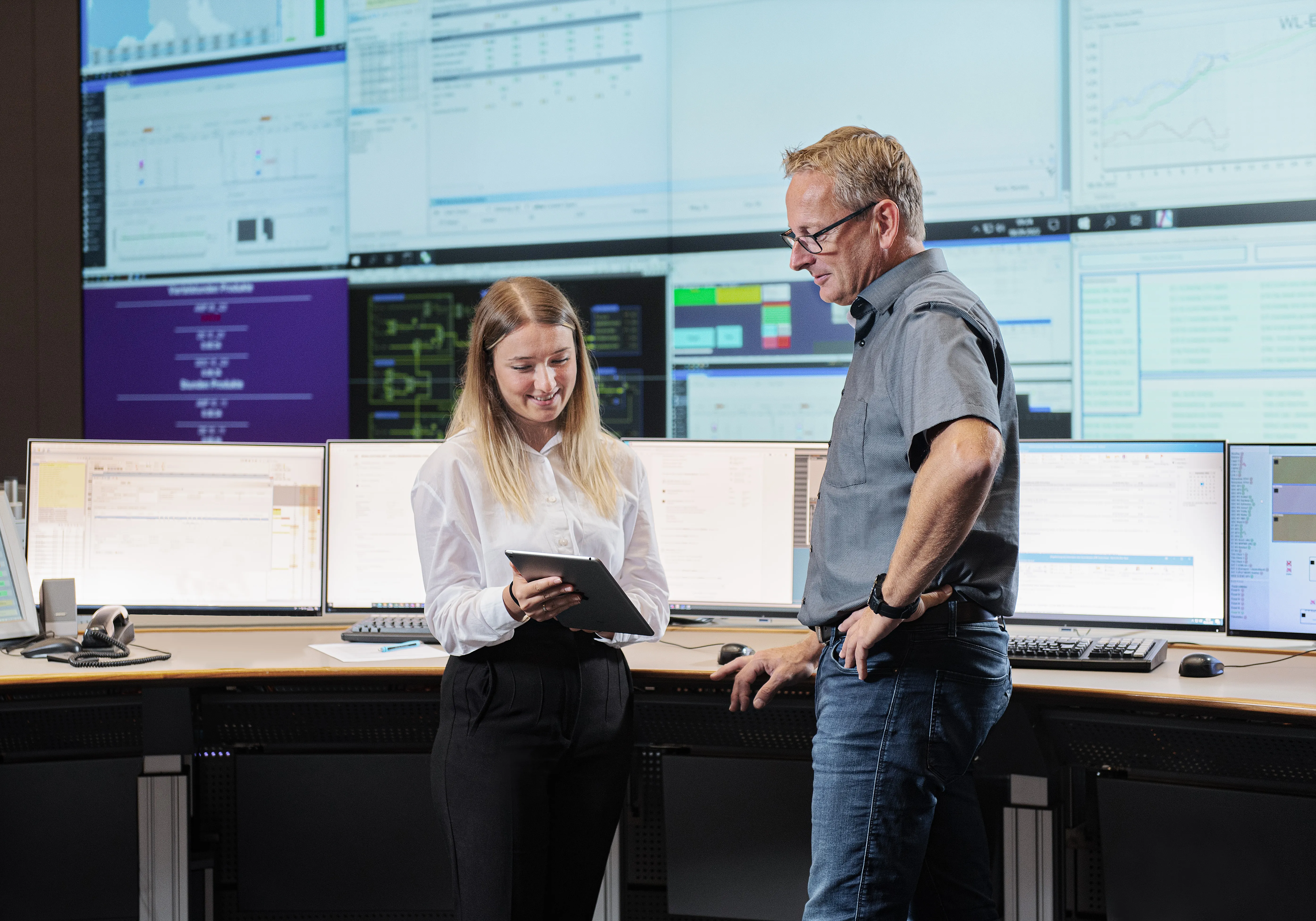 Zwei Amprion-Mitarbeiter im Gespräch in einem Büro, der Mann trägt ein lila Polo mit Amprion-Logo.