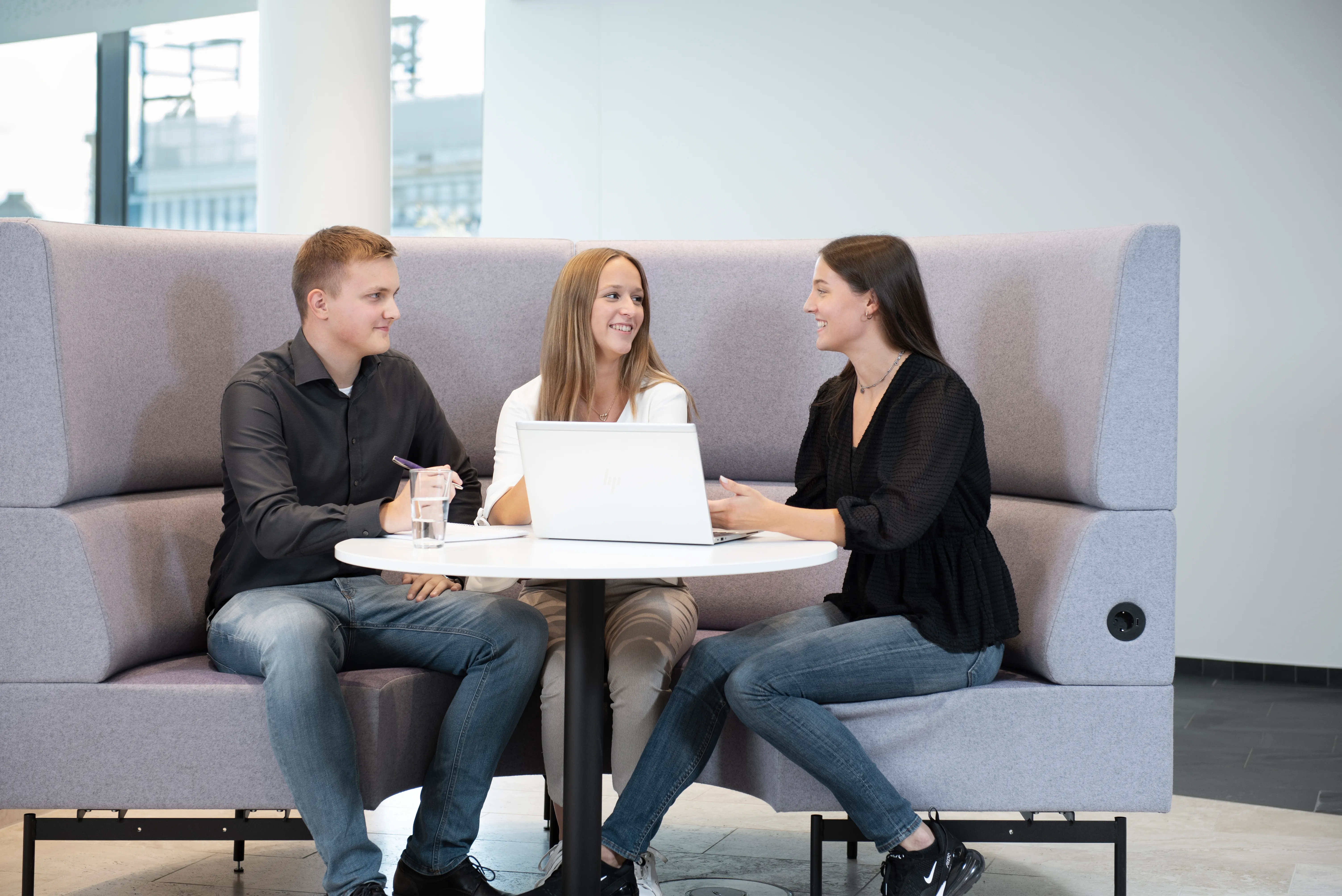 Drei junge Fachkräfte besprechen sich lächelnd an einem Tisch in einem modernen Büro von Amprion GmbH.